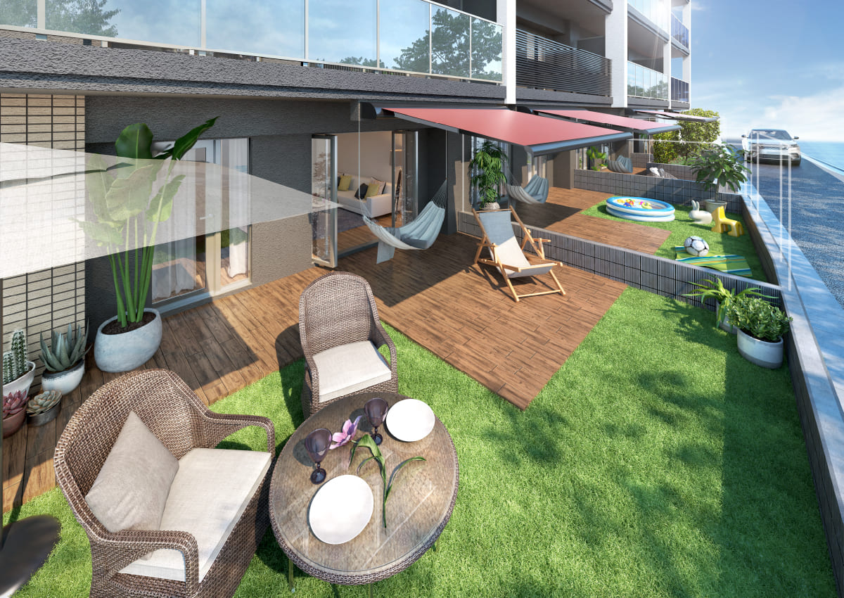 1階にはオーニング付テラス+専用庭が設置された住戸が用意され、室内リビングの延長的なスペースとしてなど、多彩な使い方が可能です。マンションで戸建のような暮らし心地を満喫できます。