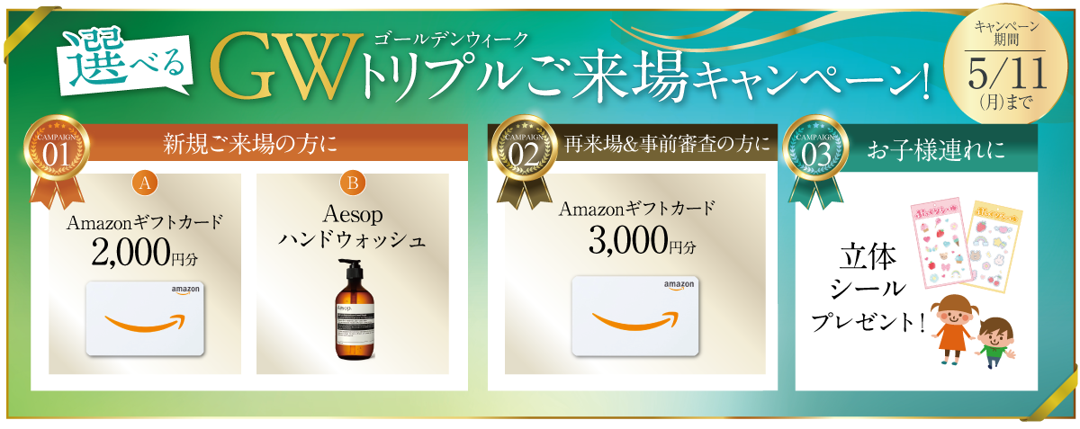 ◯キャンペーン主催:株式会社ブリス。◯新規来場キャンペーン:事前にご予約の上、はじめてマイホームをご購入される方で、お買替の方は除かれます。2名以上で本物件に初めてご来場いただき、アンケートにもれなくお答えいただいた方に限ります。数に限りがございます。無くなり次第終了とさせていただきます。1世帯1回限りとさせていただきます。◯再来場&事前審査キャンペーン:本プレゼントは住宅ローンの事前審査申込をされた方のみ対象とさせて頂きます。事前審査の申込には、ご本人様の確認書類や収入の分かる書類、お認印等が必要になります。本キャンペーンは、1家族様1回限りとさせて頂きます。◯本キャンペーンのお問い合わせは株式会社ブリスとなります。商品券等発行企業にお問合せいただいてもご対応できません。◯AmazonはAmazon.com,Inc.またはその関連会社の商標です。本キャンペーンについてのお問い合わせはAmazonではお受けしておりません。株式会社ブリスまでお願いいたします。◯虚偽の内容記載など弊社がプレゼント不相応と判断した際にはお渡しを拒否させていただくこともございます。※キャンペーンは同様の内容で継続をする場合がございます。