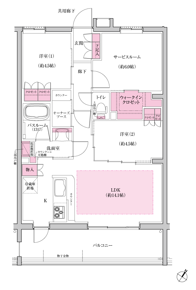F type 2LDK+S+WIC+O 専有面積/65.33㎡(約19.76坪)バルコニー面積/12.16㎡(約3.67坪) ※WIC:ウォークインクロゼット、O:オーナーズブース、SC:シューズクローク 一覧に戻る